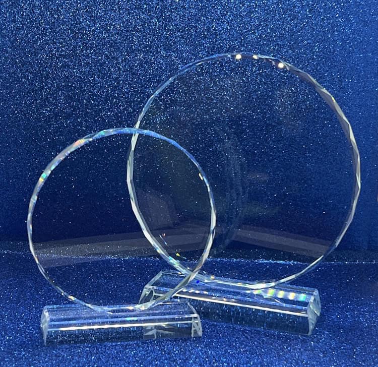 Round Crystal awards are available in 5" or 7" height, including a crystal base. Stunning clear crystal with bevelled edges makes a great award, and all writing and logos are engraved subsurface and lasting a lifetime.